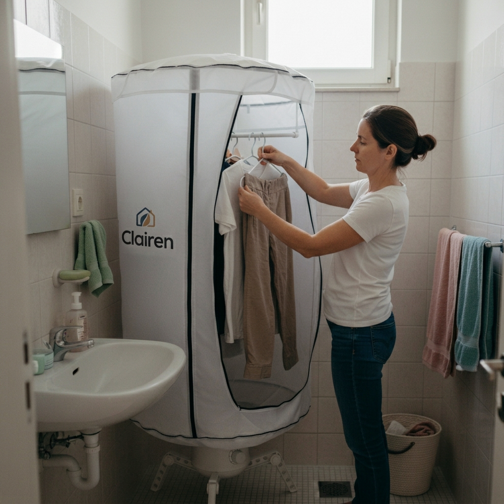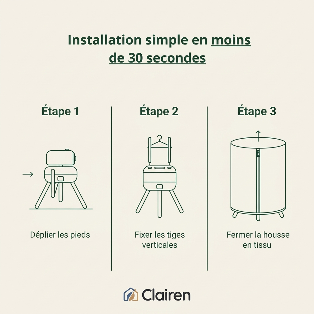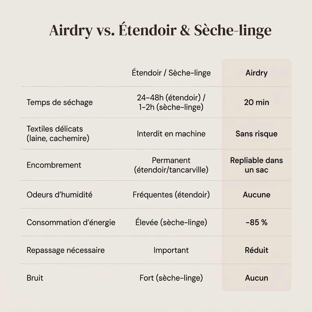 Étendoir qui traîne au milieu du salon, tancarville surchargé, vêtements encore humides après 2 jours… Et quand on passe au sèche-linge, les pulls rétrécissent, les fibres s'abîment et la facture grimpe. Il y a forcément mieux.