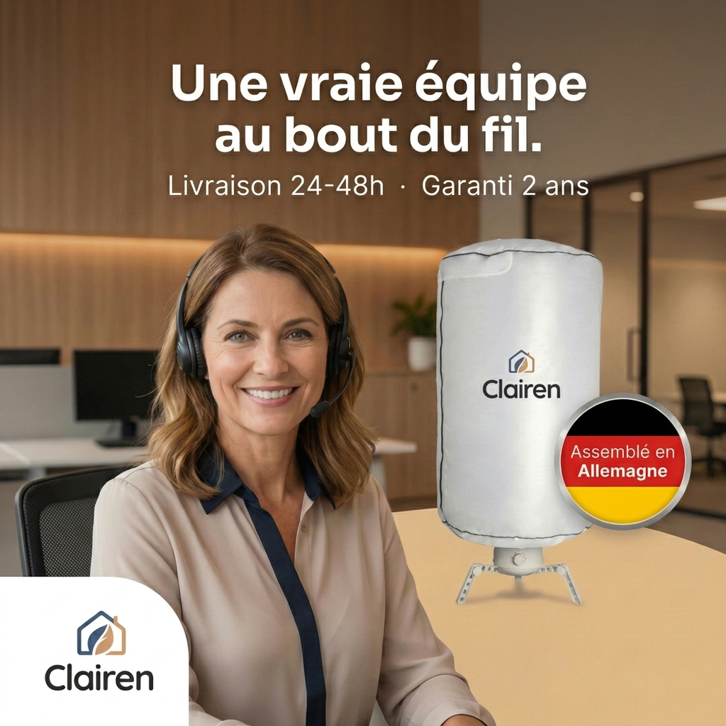 Assemblé en Allemagne et garanti 2 ans. Service client Clairen disponible par mail : contact@clairen-home.com